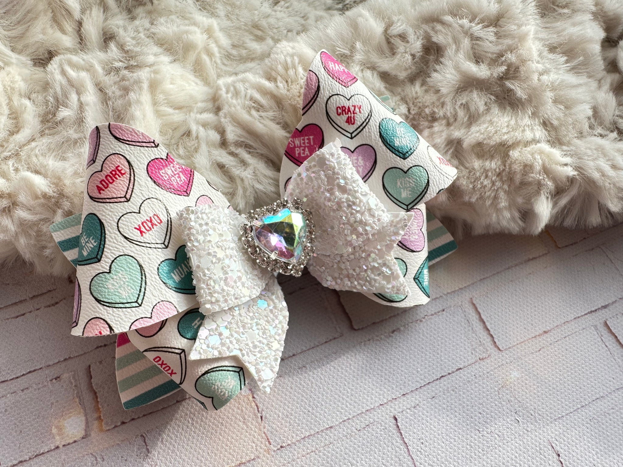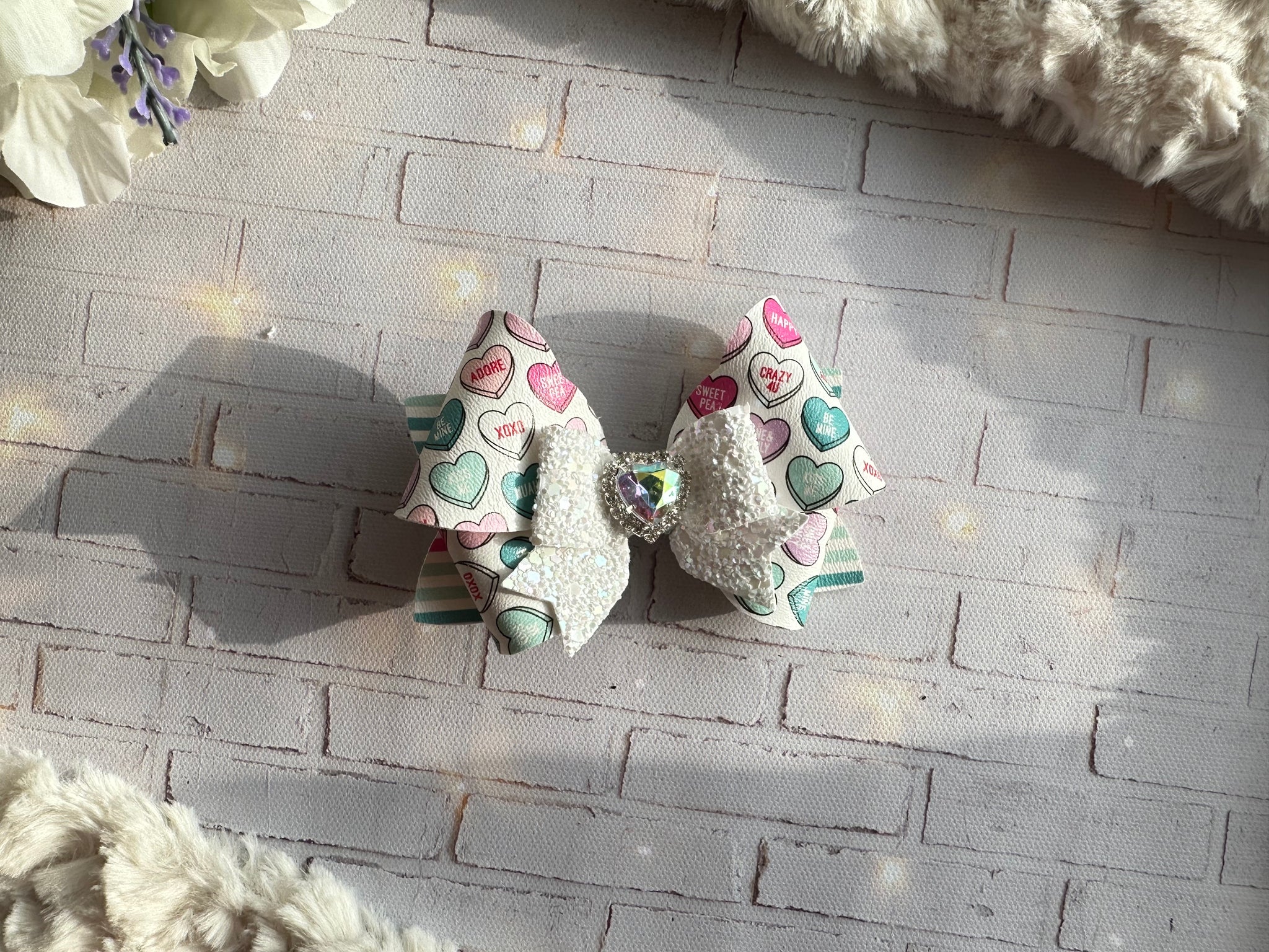 Beautiful love heart bow with heart embellishment. Approx 3.5” wide. Comes attached to an alligator hair clip.