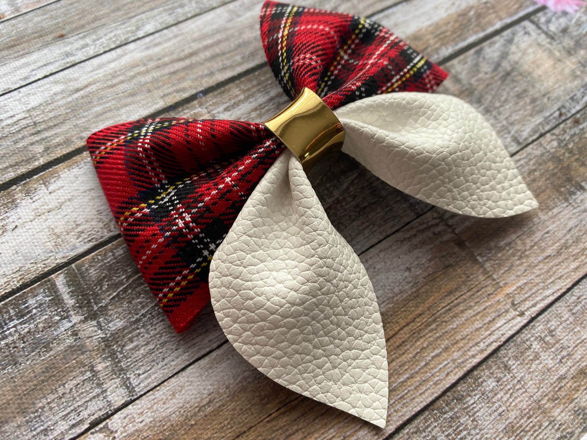 This beautiful 3.5” red tartan bow is paired with white faux leather tails and comes with a clip or headband on request. If you would prefer this attached to an Alice band, please leave a note at checkout.